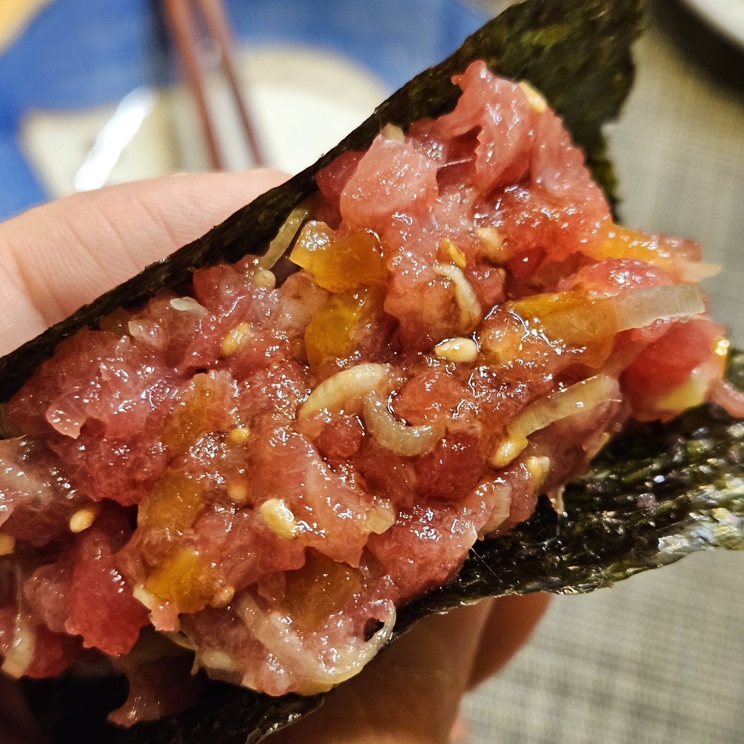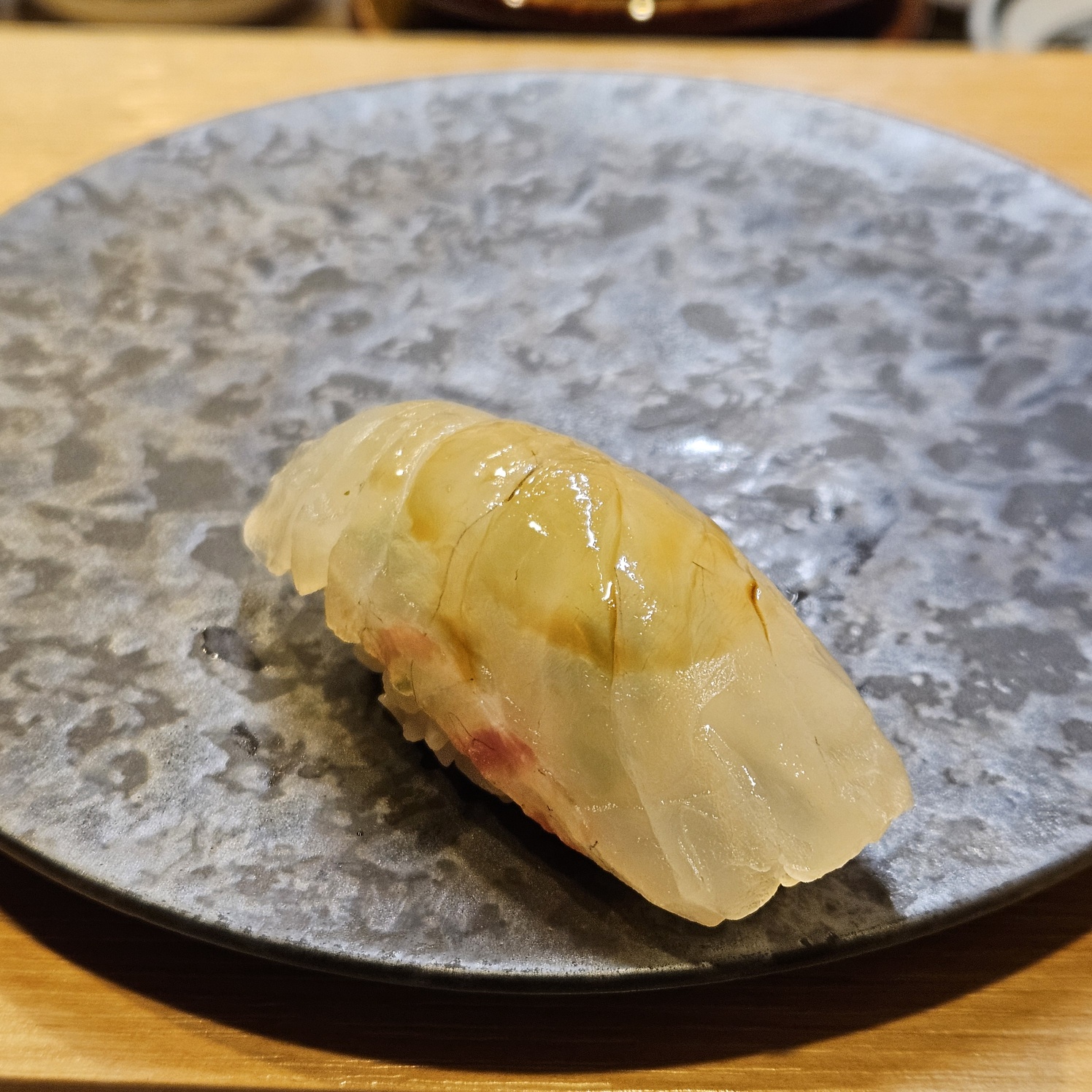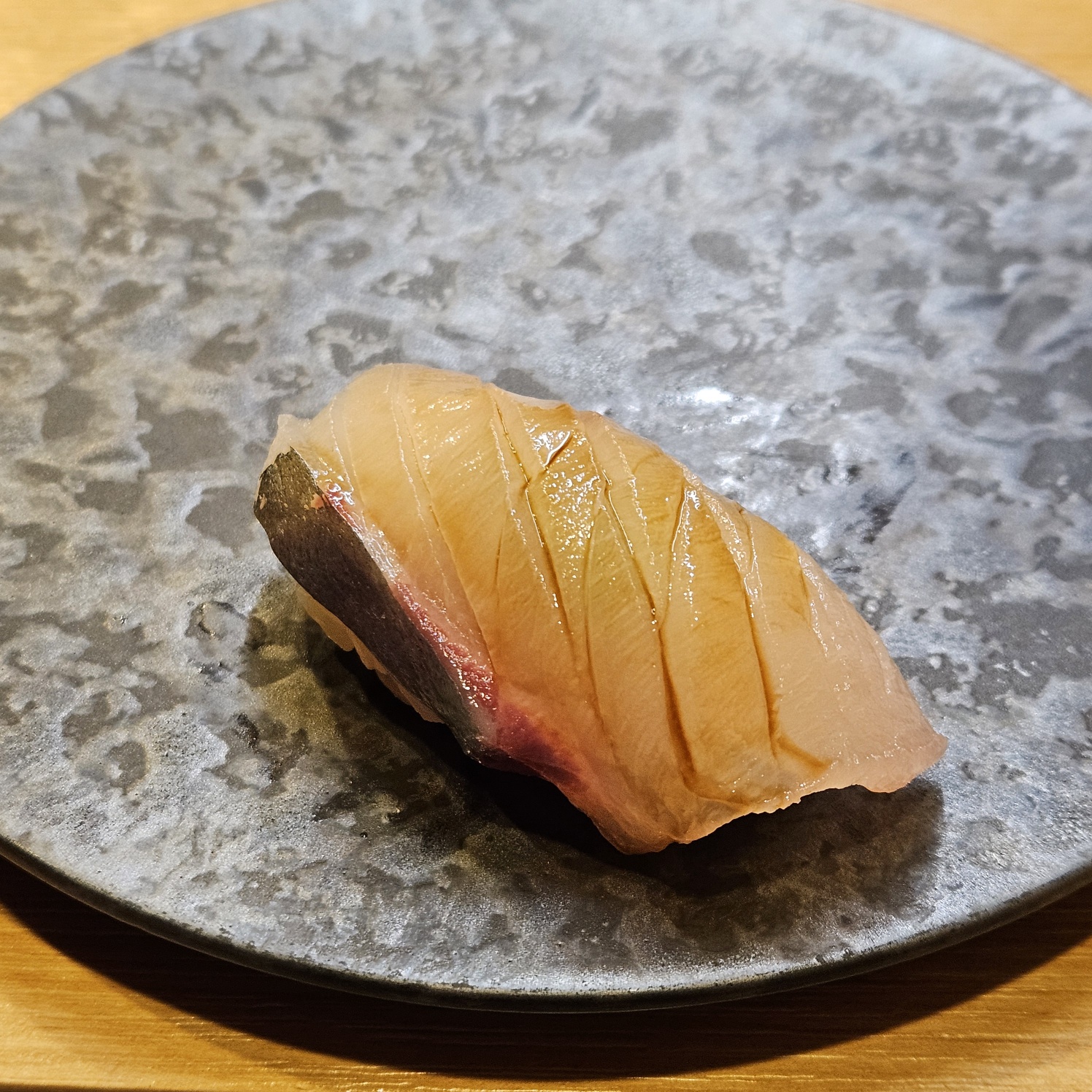 왼쪽은 네기도로마끼. 원래도 기름기가 많아서 고소함이 입 안에 퍼지는 메뉴인데, 큼지막하게 나오니깐 맛이 입 안을 더 꽉 채운다. 중간은 오도로. 식사 초반부나 중반부에 나오면 맛이 너무 강해서 식사가 전반적으로 부담스러워지는데, 끝물에 나와서 좋았다. 오른쪽은 고등어. 껍질 부분에 기름기가 많은데 토치로 껍질 부분을 그을려서인지 지방질이 더 부드럽게 느껴졌다.