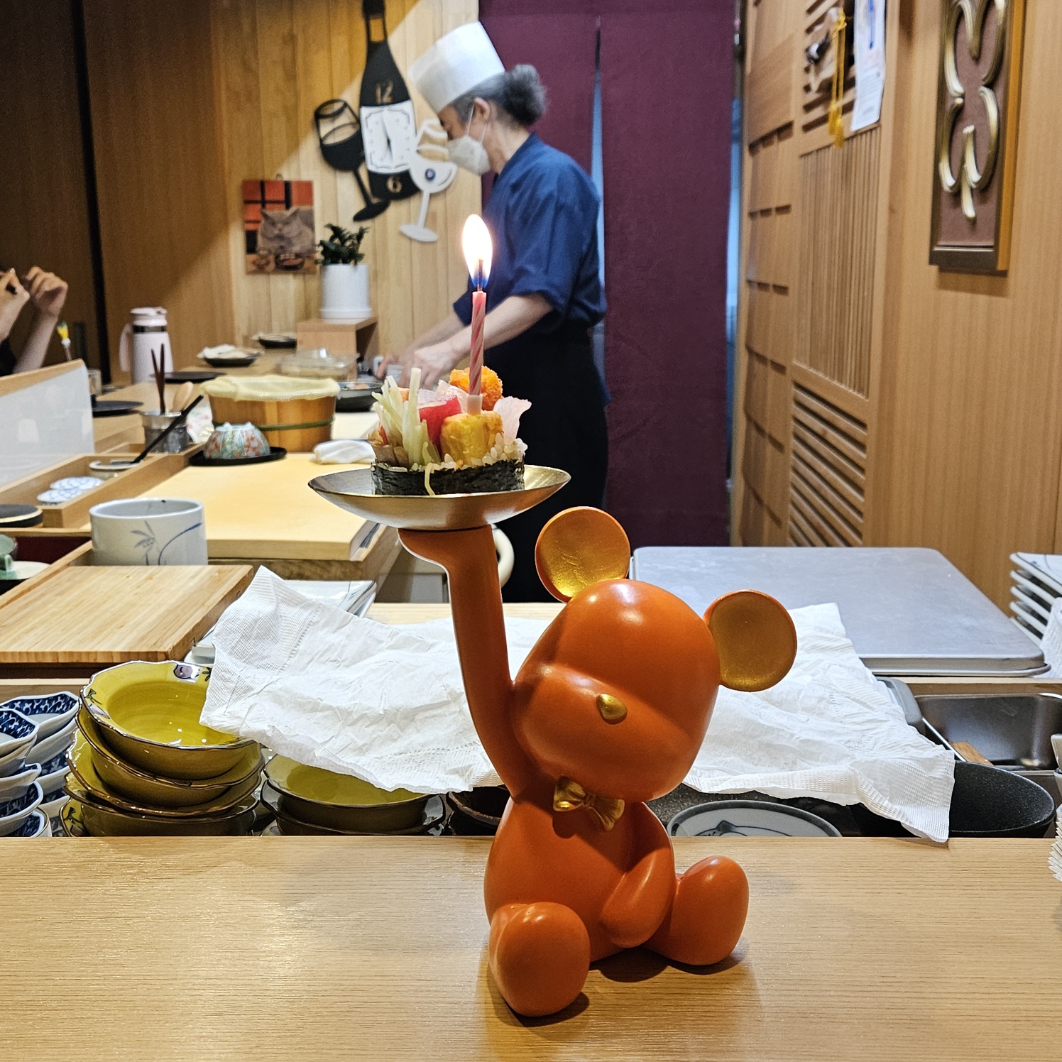 왼쪽은 소면이다. 한 두 젓가락에 다 먹을 수 있도록 가볍게 나온다. 중간 사진은 교꾸. 계란, 마, 새우살을 섞어 만드셨다고 한다. 잘 만든 교꾸는 카스테라랑 거의 구분이 안 가는 것 같다. 엄청 맛있었다. 마지막으로는 후토마끼가 나왔다. 후토마끼 끝부분은 생일이거나 기념일인 사람에게 저렇게 장식해서 주신다. 오늘은 내 생일이라서 내가 먹었다. 촛불에 불이 너무 잘 붙어서 네 번을 불어도 다시 살아났다. 마지막 메뉴로 후토마끼가 나오니깐 입에 바다가 들어온 채로 마무리되는 느낌이었다.