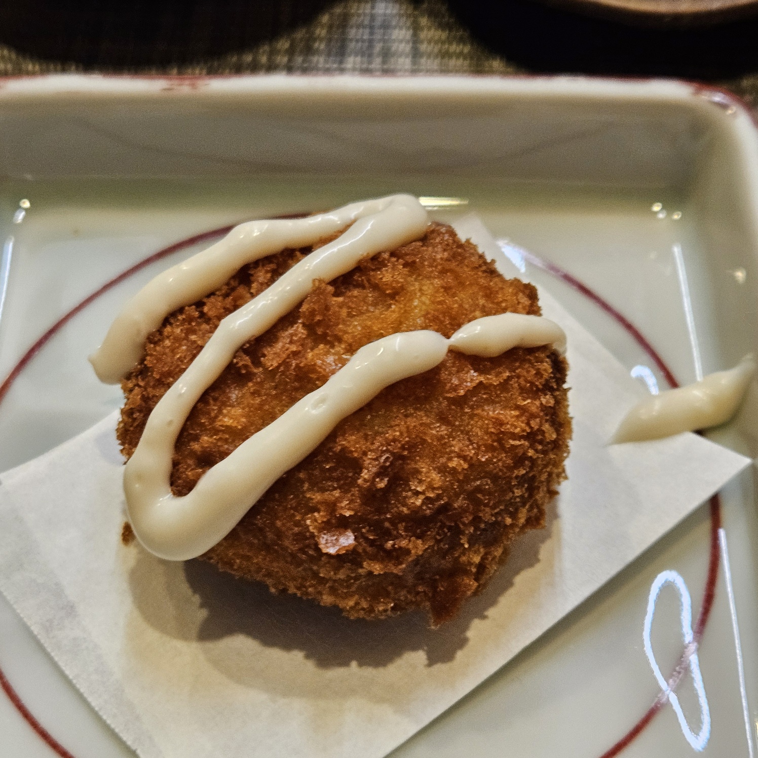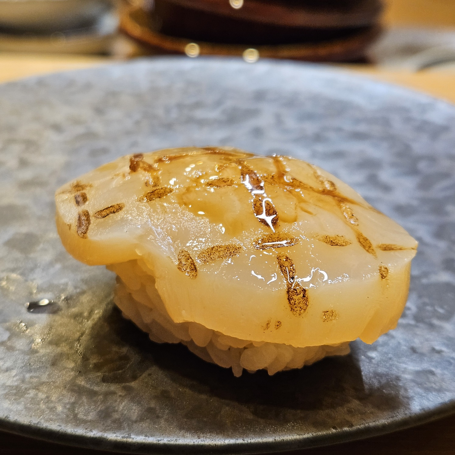 왼쪽은 가리비다. 살짝 표면만 구워져 있는데, 그래서 더 좋았다. 조금씩 탄 듯한 맛이 나니깐 훨씬 맛이 풍부하게 느껴진다. 중간은 카레고로케. 카레 향이 강해서 초밥 맛을 방해할 줄 알았는데, 과하지 않게 들어가서 딱 기분좋게 먹을 수 있었다. 오른쪽은 전갱이.