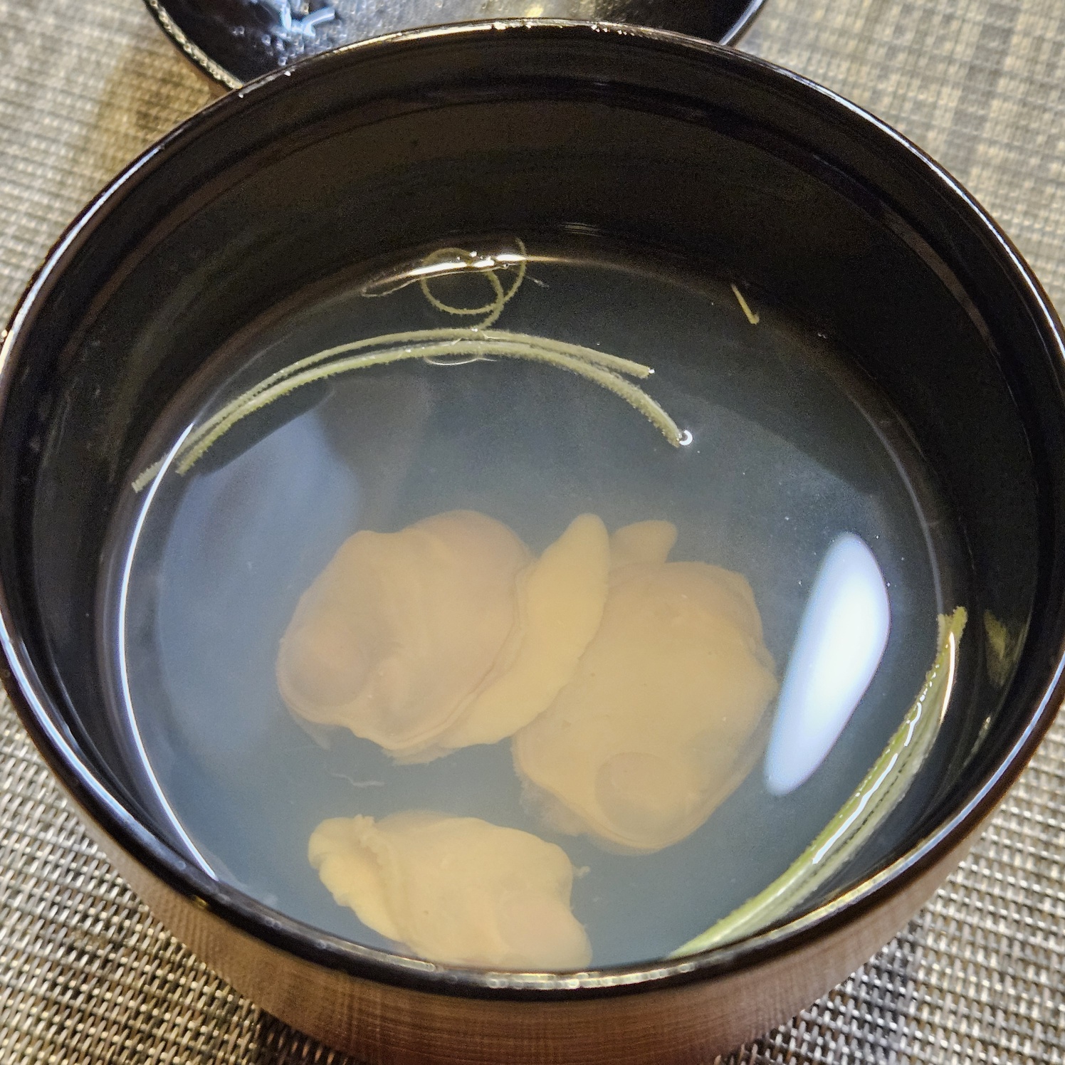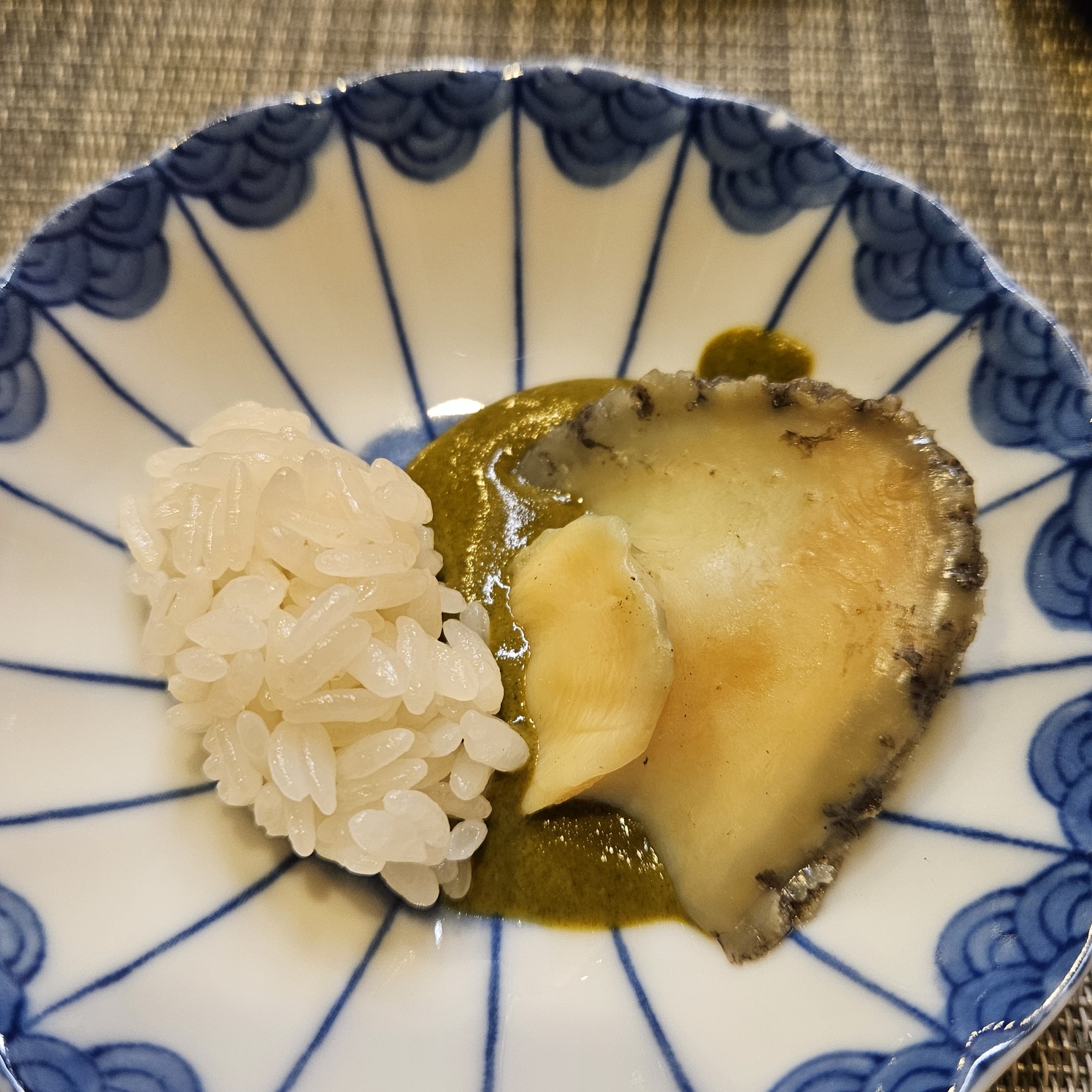 왼쪽은 전복과 내장소스다. 전복을 소스에 찍어 먹고 난 후, 남은 소스에 밥을 비벼 먹으면 된다. 입 안을 가득 채우는 향과 맛이었다. 중간 사진은 중합으로 만든 국이다. 국물도 맛있고 조개도 너무 맛있었다. 조개는 확실히 백합이랑 중합이 제일 맛있는 것 같다. 오른쪽은 다시마로 숙성한 참돔이다. 츠마미로 먹은 참돔보다 살이 더 연하고 매끈한 느낌이다.