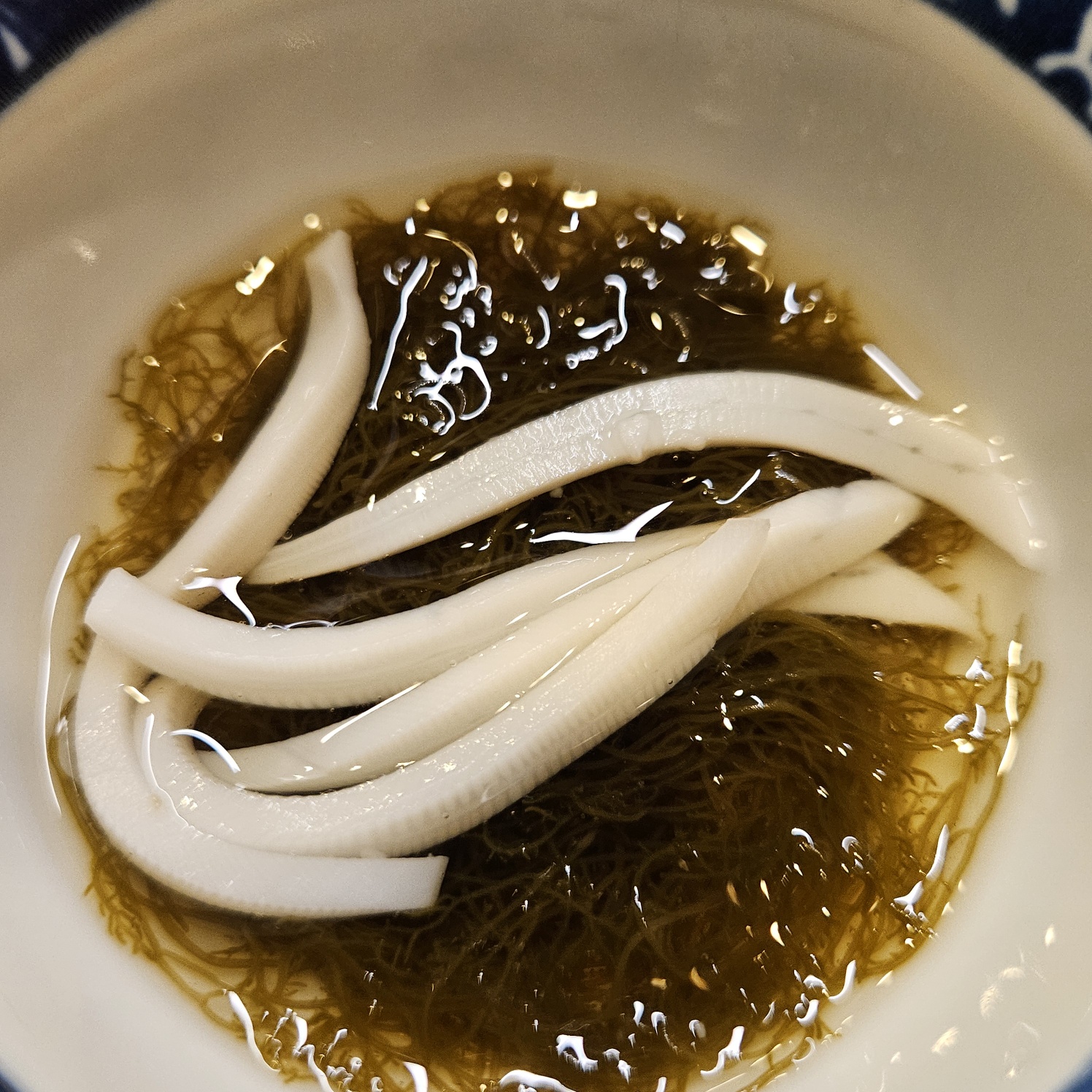 왼쪽은 줄무늬전갱이다. 5월에서 7월이 제철인 생선인데, 겨울방어의 상위호환이라는 말이 많다. 살이 담백하고 씹는 맛이 좋았다. 중간 사진은 전갱이 된장무침이다. 시소 잎이 들어가서 향긋하고 짭쪼름한데, 술과 함께 먹으면 맛있다. 오른쪽은 한치가 올라간 해초채. 새콤한 맛이 한치랑도 잘 어울렸다.