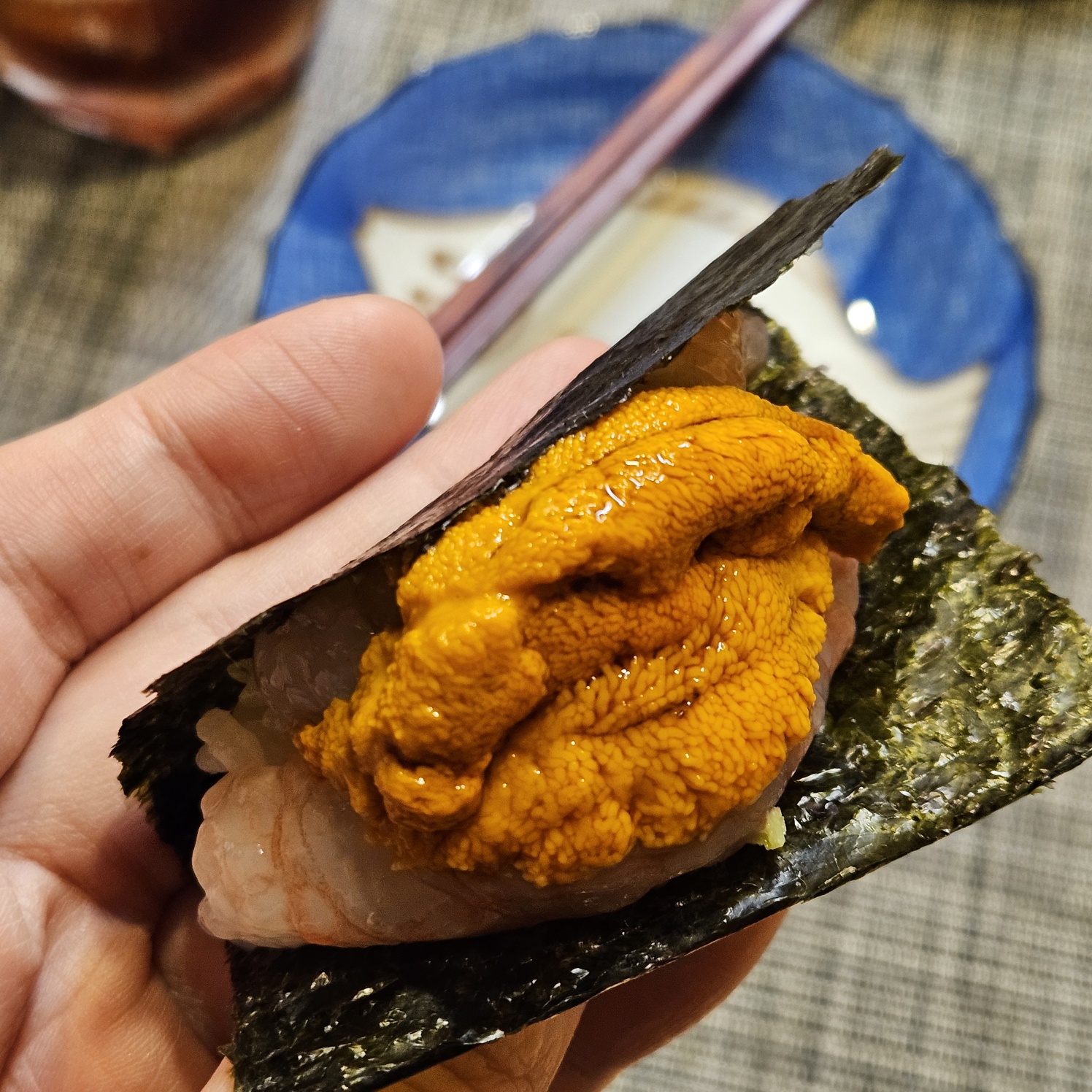 왼쪽은 한치. 한치도 6월부터 9월이 제철이라 그런지 이 시기때 먹으면 살이 정말 탱글탱글하고 쫀쫀한 것 같다. 중간은 줄무늬전갱이. 오늘 세 번 나온 네타인데 계속 먹어도 맛있다. 오른쪽 사진은 단새우와 우니다. 원체 부드러운 재료들인데, 샤리 온도가 따뜻한 편이라서 그런지 더 입 안에서 녹는 맛이었다.